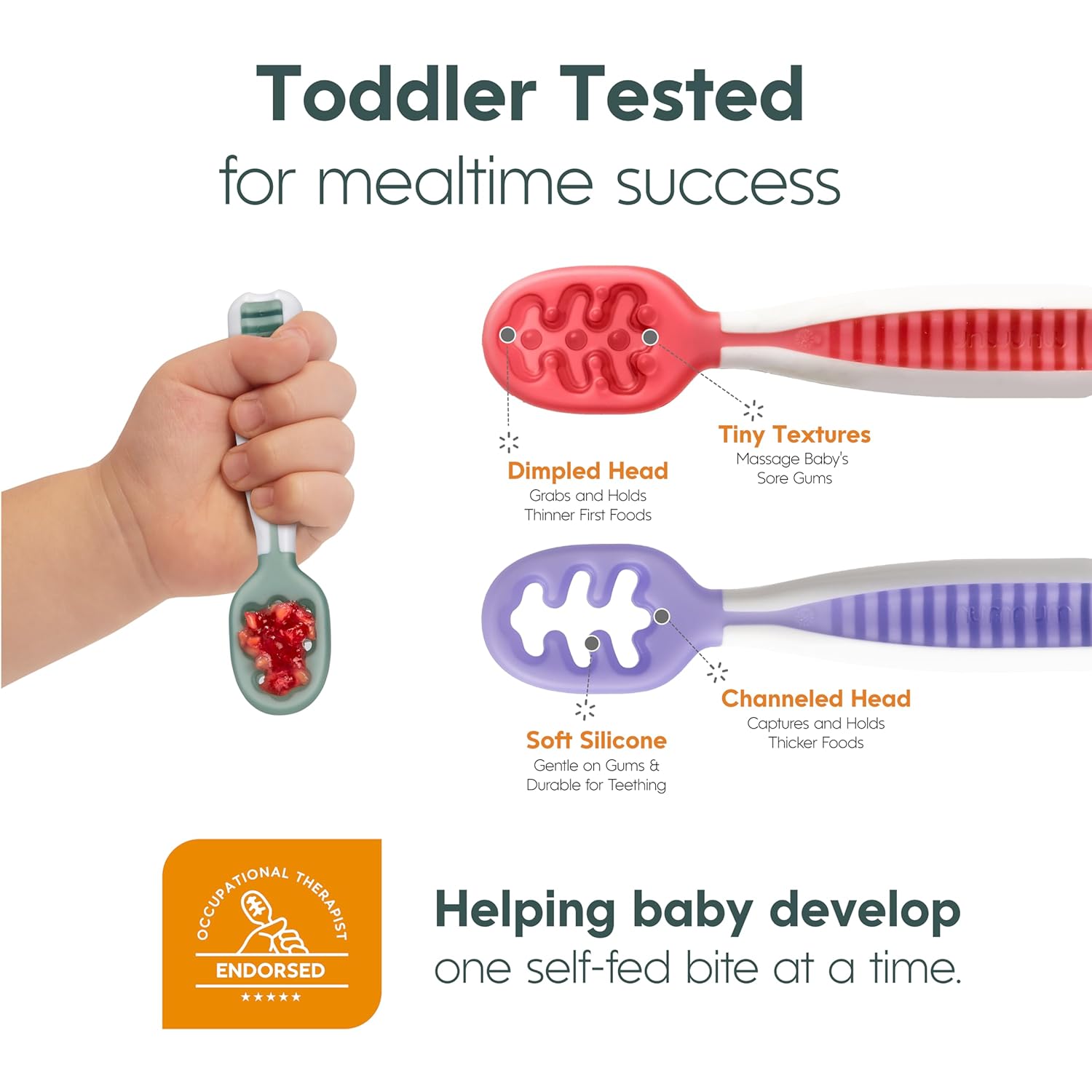 - SIMPLE TO CLEAN & PEDIATRIC OT RECOMMENDED: Approved and tested by baby care experts, our spoons are incredibly durable, ensuring long-lasting use. Made with food-grade silicone, they’re free from harmful chemicals like BPA and phthalates so you can feel good about giving them to your little one. Clean-up is easy in the dishwasher. Microwave or steam sterilizing is not recommended.