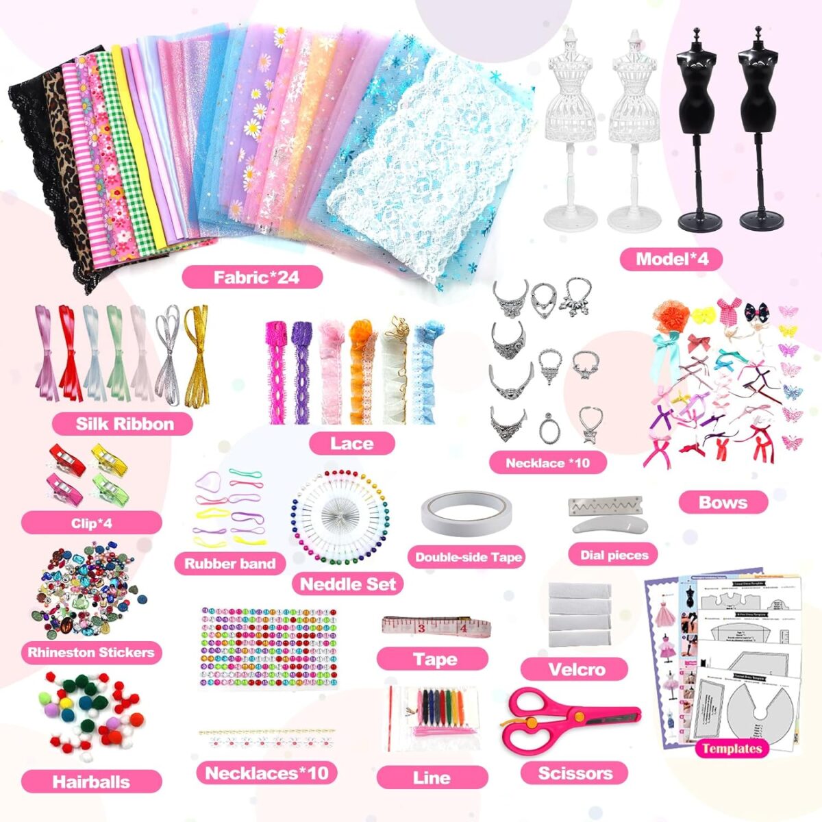 - Deluxe Fashion Design Kit – Unleash your creativity with a carefully curated collection of over 600 materials, allowing you to create more than 80 unique garments. The package includes 4 mannequins, 24 fabrics, 6 ribbons, clothing templates, a tape measure, scissors, sewing tools, over 30 bows, rhinestone stickers, and 200 other decorations. A rich variety to meet all your fashion design needs.