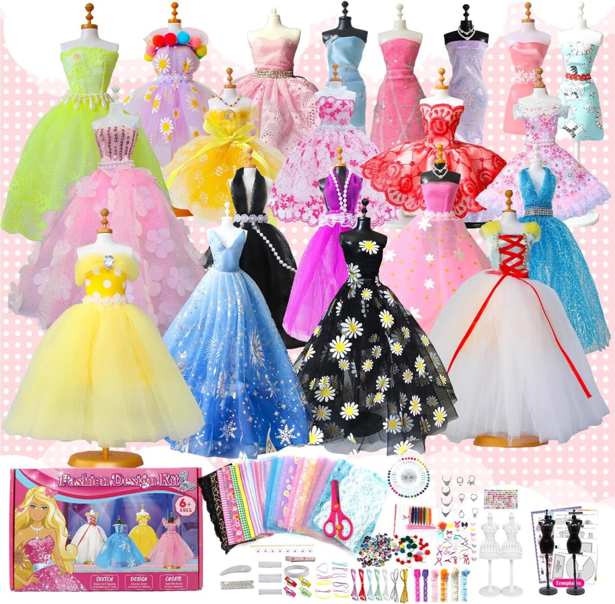 Fashion Designer Kits for Girls,600Pcs Creativity DIY Arts & Crafts Dress Kit for Kids,Doll Clothes Making, DIY Sewing Kit for Kids Girls