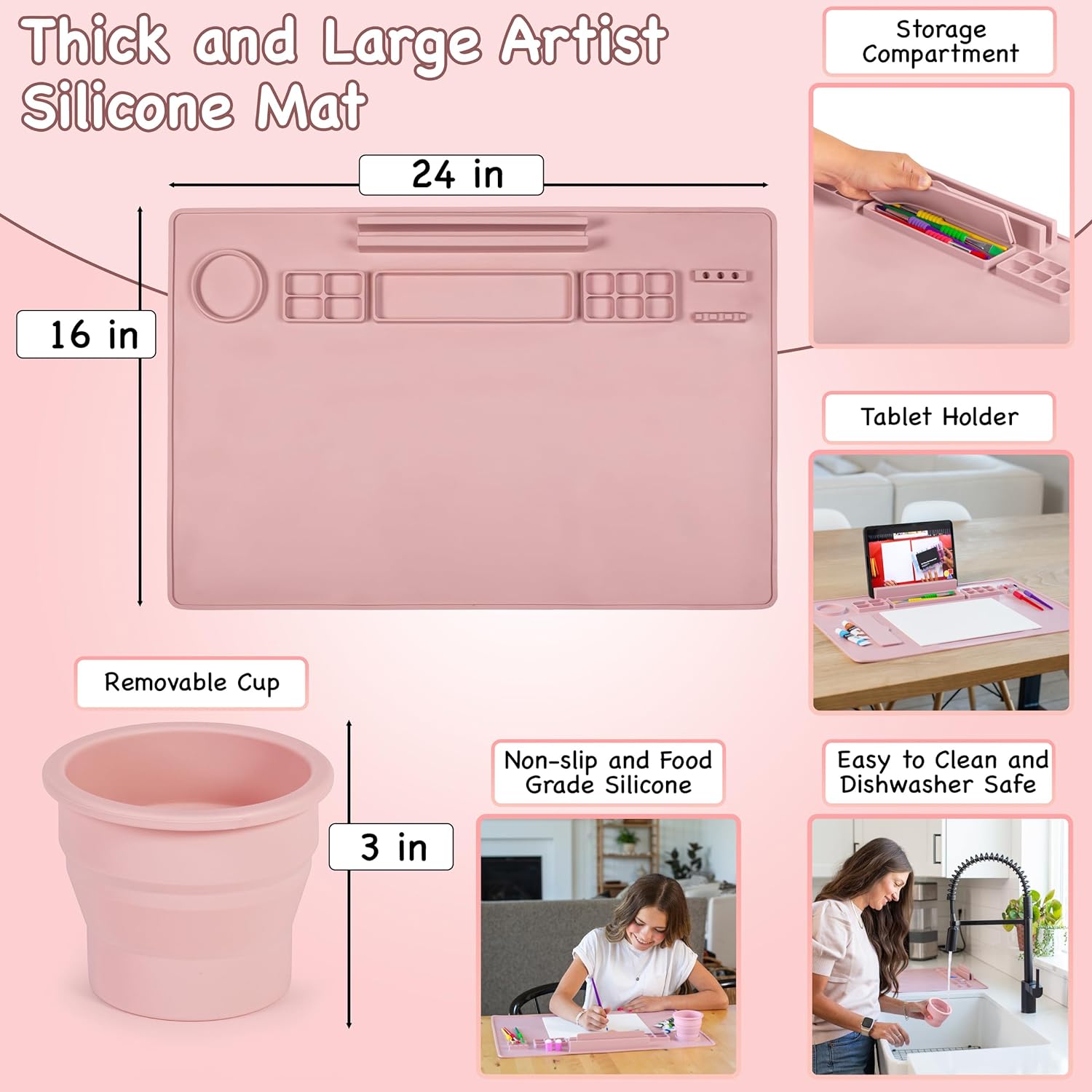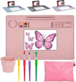 Large Silicone Craft Mat – Painting Mat – Crafts Organizer – Thick Nonstick Silicone Sheet – Art Gifts for Kids & Adults – Tablet Holder, Brush Cleaner Cup, Paint Brushes
