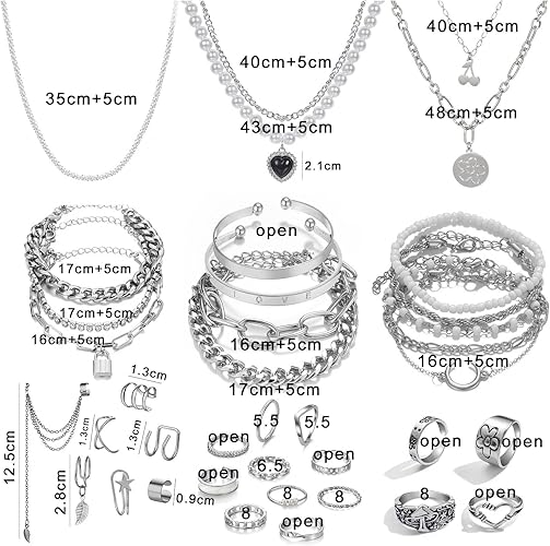 Silver Plated Jewelry Set with 3 PCS Necklace, 12 PCS Bracelet, 7 PCS Ear Cuffs Earring, 14 Pcs Knuckle Rings