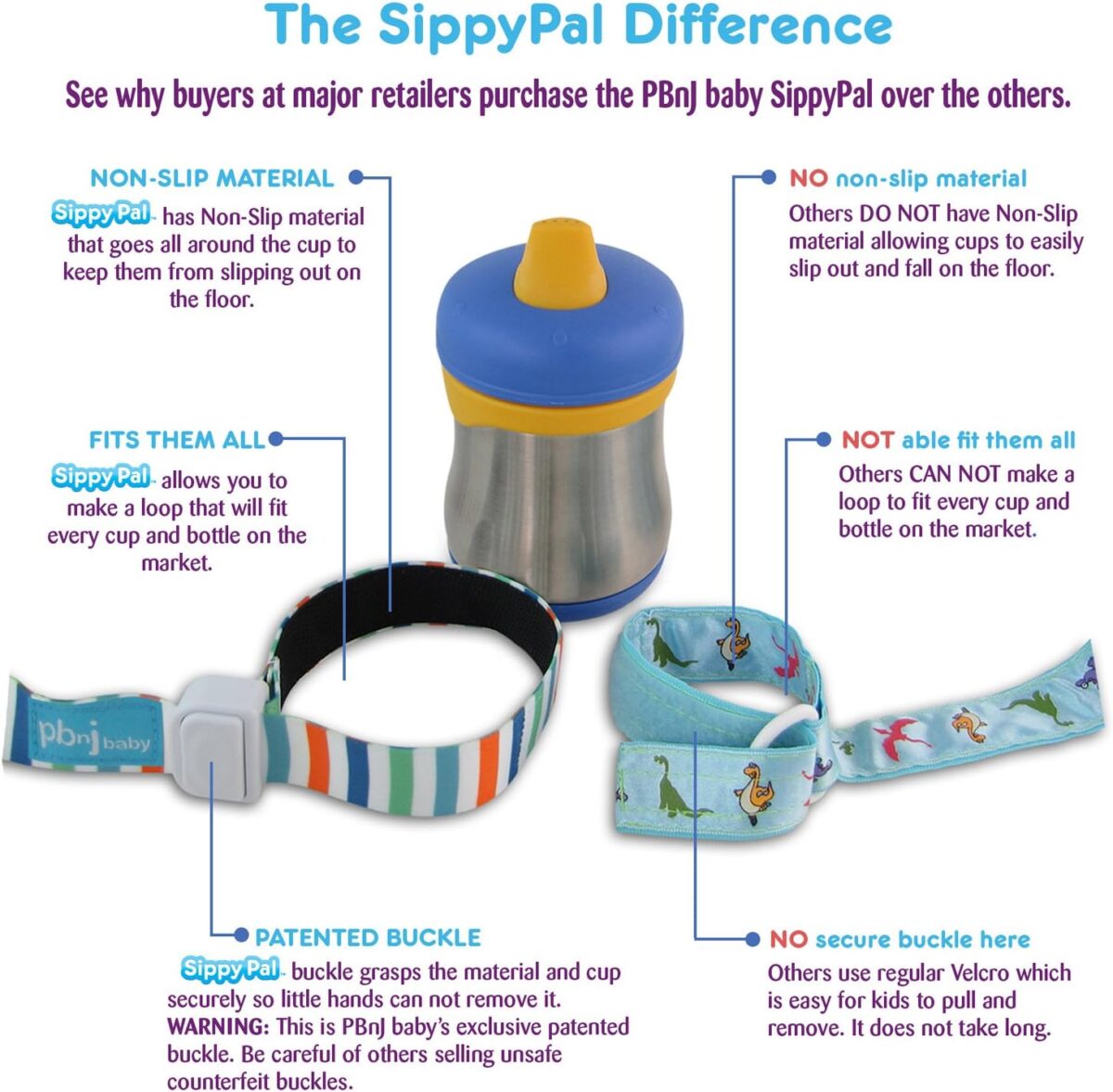 - PATENTED – Push button buckle keeps cups and bottles secure so little hands cannot remove the SippyPal. Others use Hook And Loop which is easy for children to remove allowing them to lose their cup or bottle. See images to learn more!